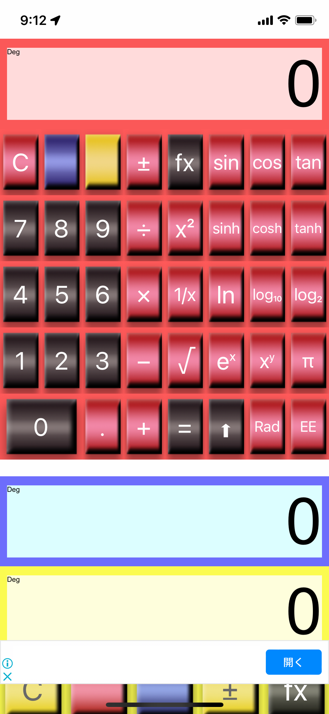 赤の電卓を表示しているときにさらに赤い窓をタッチすれば赤い電卓のみを表示することもできます。 さらに、もう1回赤い窓をタッチすれば元の3つの電卓表示に戻ります。科学技術計算にも対応しています。 [fx]ボタンをタッチすれば色々な関数のボタンが表示されます。 |